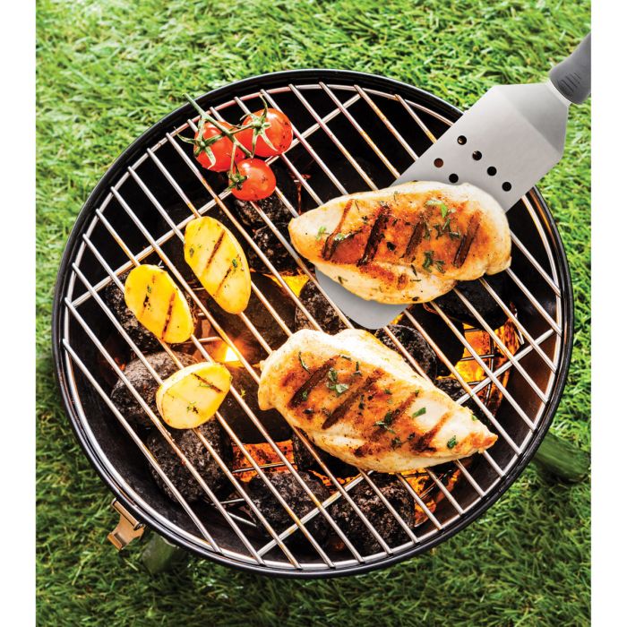 - Angled handle comfortably maneuvers and lifts food; ideal for burgers, sausage, steaks, chops, grilled sandwiches, pancakes, hash browns, and more